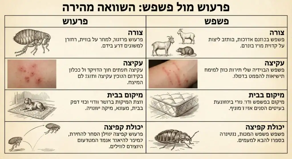 הבלבול מובן, שני החרקים קטנים, ניזונים מדם וגורמים לעקיצות מגרדות. אך כאן הדמיון ביניהם מסתיים. מדובר בשני יצורים שונים לחלוטין מבחינה ביולוגית, עם הרגלים, מקומות מחיה ושיטות הדברה שונות בתכלית. הבנה של ההבדלים היא קריטית, כי שימוש בפתרון המיועד לפרעושים לא ישפיע כלל על נגיעות של פשפשי מיטה, ויאפשר למצב רק להחמיר.